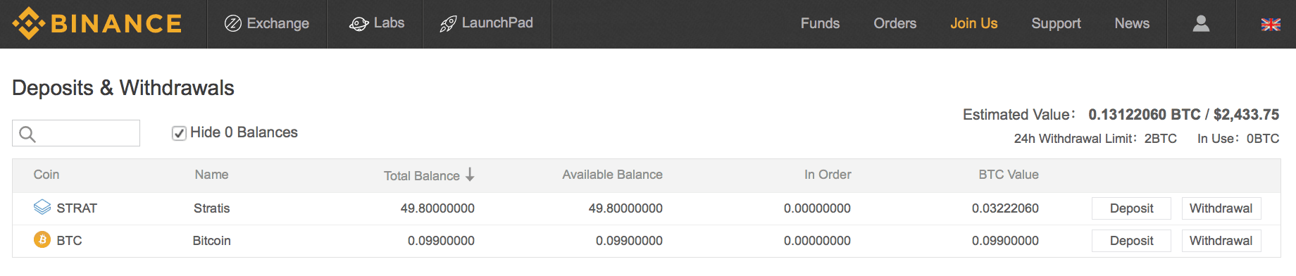 Alle digitale munten die op Binance staan, zie je hier. Je kunt naar beneden scrollen om alle digitale munten te bekijken en daarnaast kun je zoeken via ‘Search’. Je hebt daarnaast de optie om alle digitale munten waar je geen saldo van hebt te verbergen. Klik maar eens op ‘Hide 0 Balances’.