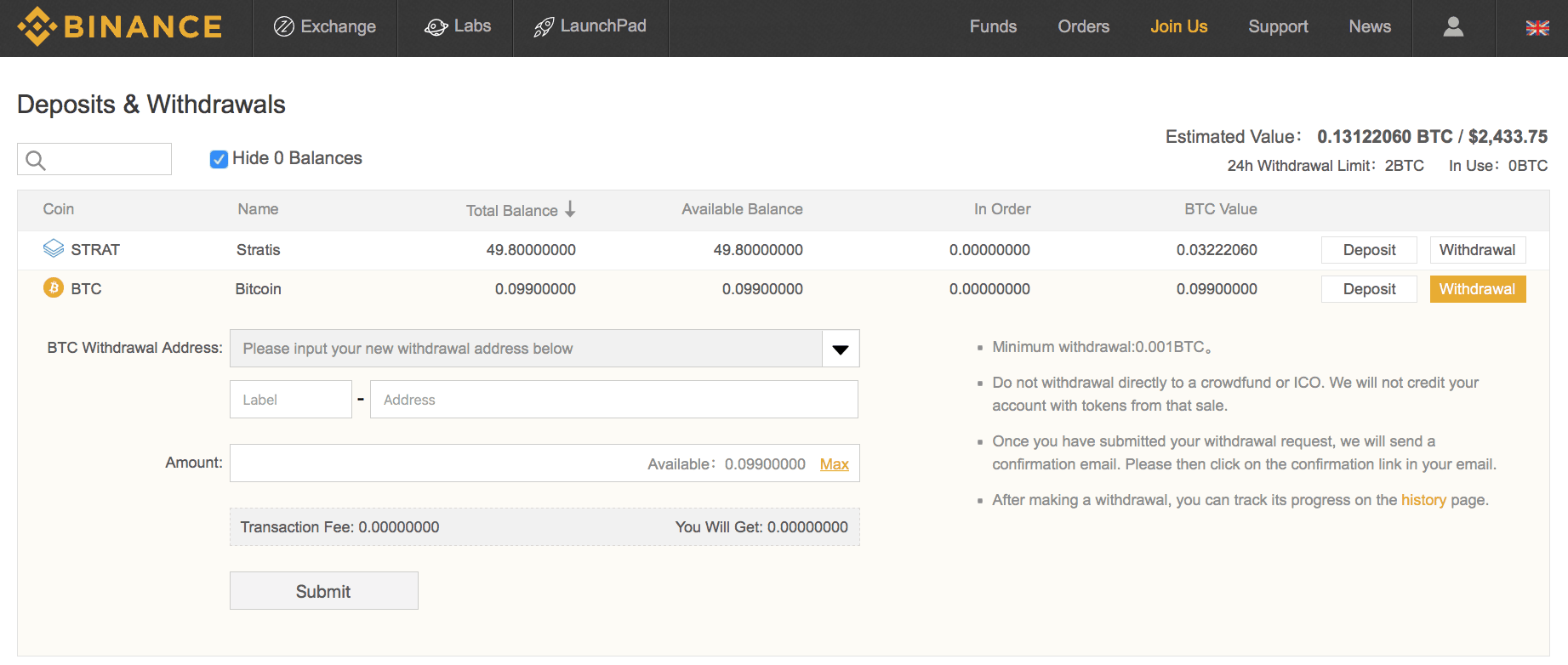 - Stap 3: Klik bij ‘BTC’ op ‘Withdrawal’